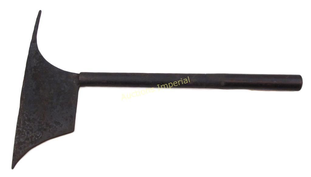Bontok work, the handforged steel head of typical form, with wooden haft and long iron ferrule. Early 20th century. Heavily worn. Overall length 40 cm.