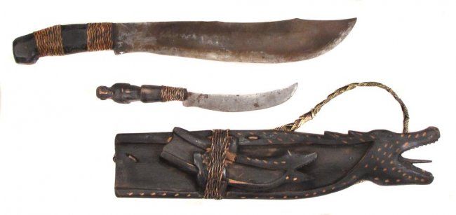 With massive blade, in its carved wooden scabbard with by-knife. 20th century. Overall length 56 cm.