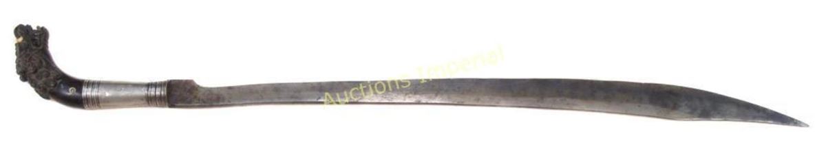 The large, Visayan tenegre-type blade very well forged, displaying layering and a hardened, chisel edge, the silver ferrule Moro work, and the fine horn grip carved in the form of a fully-modeled dragon’s head, elaborately detailed, with inlaid eyes, showing Chinese influence. Late 19th – early 20th century. Light wear. Overall length 80.3