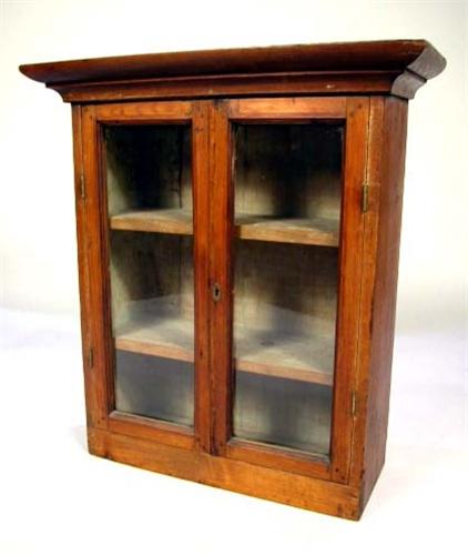 A PINE HANGING WALL CUPBOARD; American, with an overhanging cornice and two glazed doors (lacks paint) 29 1/2"h x 26 1/2"w x 11"d