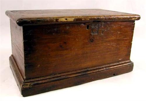 A PINE LIFT-TOP DOCUMENT BOX; The lid opening to reveal a well, patches to lid, wear throughout 11"h x 21 1/4"w x 11 1/4"d