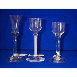 A PLAIN HEAVY OGEE BOWLED CORDIAL GLASS, c.1760 PROBABLY NEWCASTLE, 14cms high; a waisted small bowled wine glass, c.1745, with tear drop and folded foot, 16cms high; and a ogee shaped cordial glass, with multiple airtwist spiral stem, probably Newcastle, c.1755-65 (3)