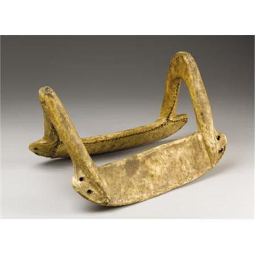 <B>A PLAINS WOMAN'S SADDLE</B></I><BR><BR>c. 1870<BR> composed of a wood frame covered with rawhide, stitched with sinew<BR><BR>Length: 18 inches <B>Condition Report:</B> Overall fair. Heavy wear & soiling. Sinew stitching undone along length of saddle on one side. No apparent restoration.<BR><BR><b>Shipping:</b> Requires 3rd Party Shipping (<a target="_blank" href="http://www.heritageauctions.com/common/shipping.php">view shipping information</a>)