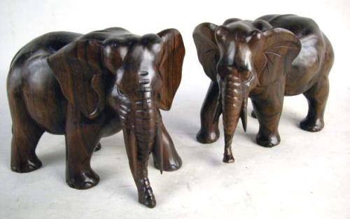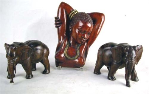 A PLASTER CAST AFRICAN WOMAN RELIEF Together with a pair of carved Rosewood elephants