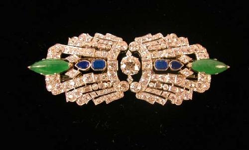 A PLATINUM 18K WHITE GOLD DIAMOND, JADE AND LAPIS LAZULI ART DECO BROOCH; With 2 marquise cabochon nephrite jades, 2 pear shape and 2 emerald cut Lapis Lazuli bezel set, center Old European cut diamond, est. weight 1.54 ct, pin is double shield shape that can be worn individually or as one pin, 60 Old European cut, est. 5.96 ct, 4 Old European, est. weight 1.00 ct, 8 straight baguette diamonds, est. weight .66 ct
