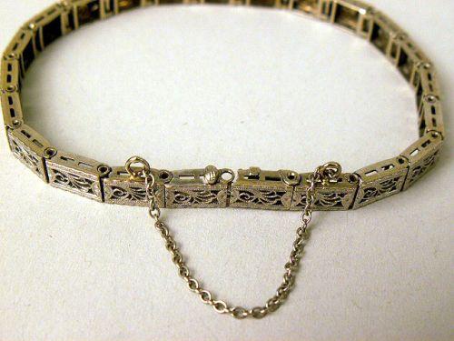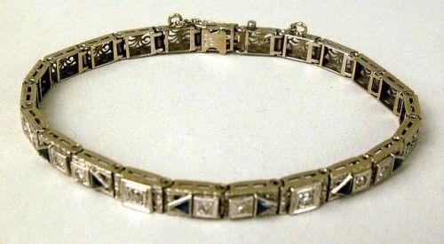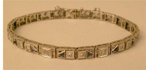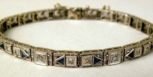 Set with eight single cut round diamonds and six triangle cut sapphires, with safety chain.