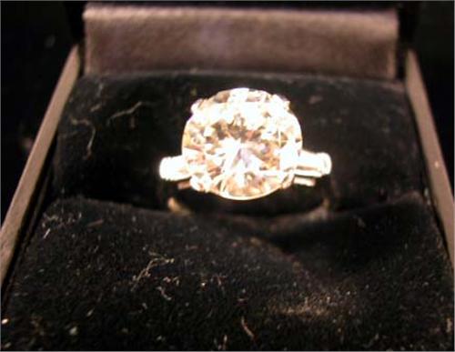 A PLATINUM AND DIAMOND ENGAGEMENT RING; Center Old European cut diamond, estimated weight 3.54 ct., with 2 side tapered baguette diamonds channel set