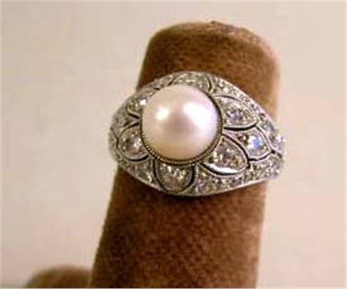 A PLATINUM DIAMOND AND PEARL RING; With 36 small diamonds centered by pearl, 7mm