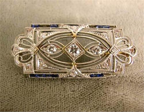 A PLATINUM DIAMOND, SAPPHIRE FILIGREE BROOCH; (Possibly missing some sapphires)