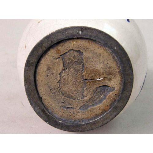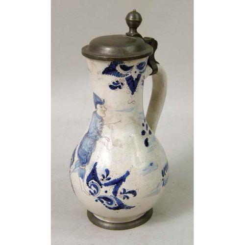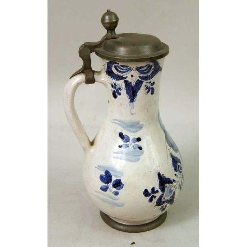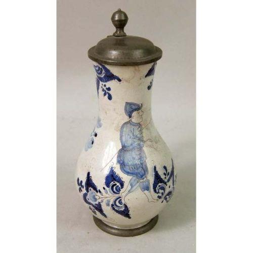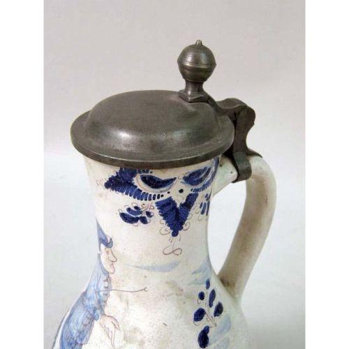 A POLYCHROME-DECORATED AND PEWTER-MOUNTED TIN GLAZED EARTHENWARE PITCHER<BR><BR>Continental, 9-1/2"h