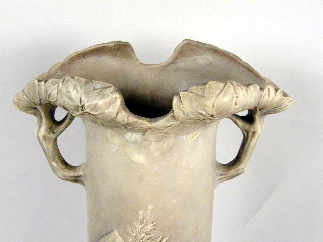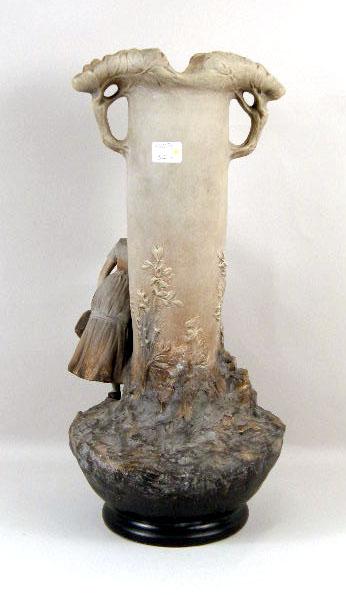 A POLYCHROME-DECORATED DOUBLE-HANDLED FIGURAL PORCELAIN VASE