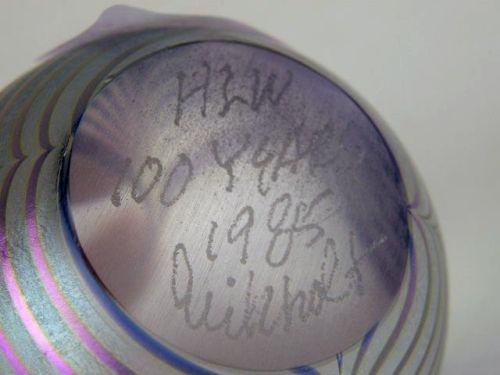 <B>A POLYCHROME-DECORATED GLASS PAPERWEIGHT</B><BR><BR>Engraved "HLW 100 years 1985 Quilholt". Together with another paperweight inscribed "Lundberg Studios 1991". 3 3/4"h and 2 1/2"h, respectively