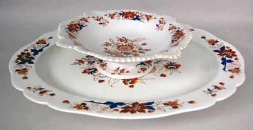 A POLYCHROME DECORATED IRONSTONE PLATTER; With shaped border, 20-1/2"l, together with a similar pattern footed compote, with shaped fluted border, 12-1/2", losses