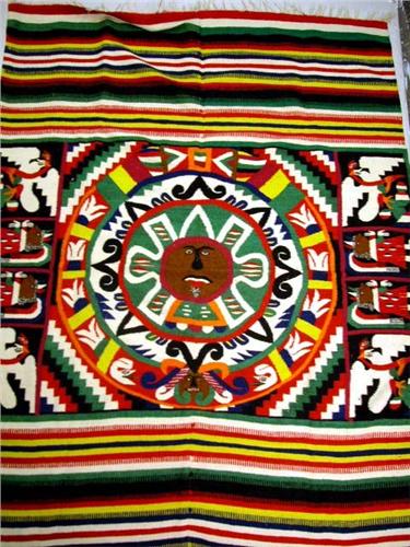 A POLYCHROME DECORATED NAVAJO BLANKET; With central medallion flanked by figures and birds 4'5"w x 6'10"l