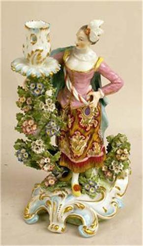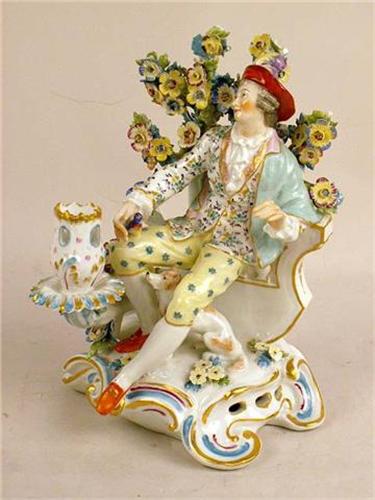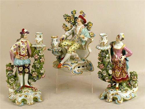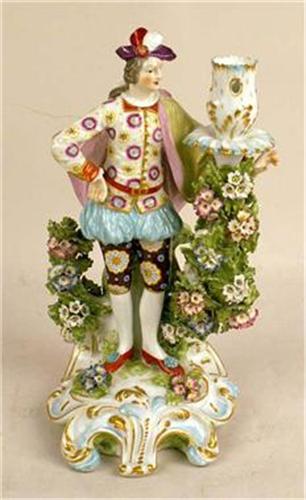 Of a seated man, marked with anchor, possibly Chelsea. Together with two polychrome-decorated parcel-gilt figurines, all fitted with a candlesocket, 3 pieces 11"h