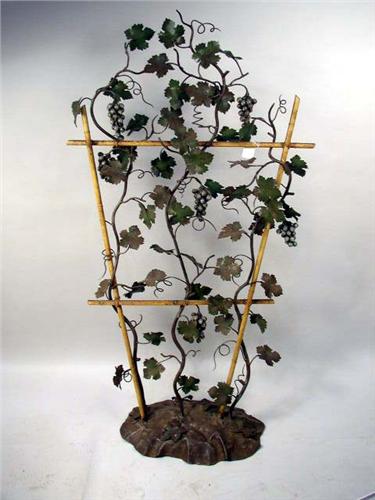 A POLYCHROME DECORATED TOLE GARNITURE; In the form of a bamboo grape arbor laden with fruit. 6'2"h x 33"w