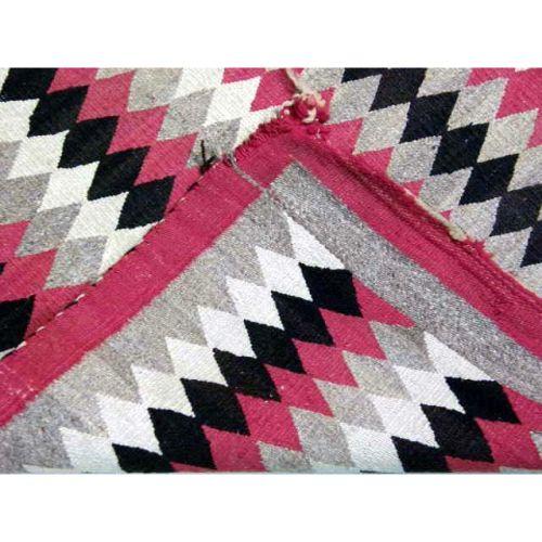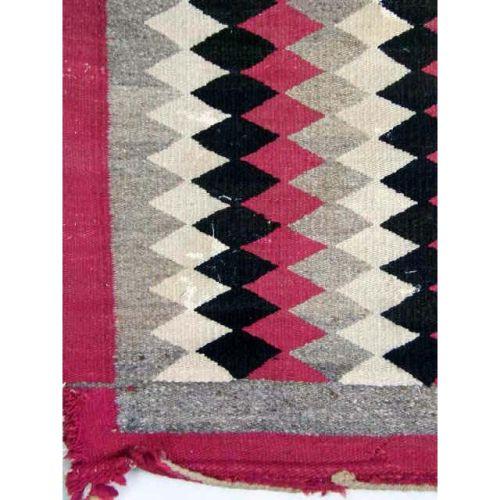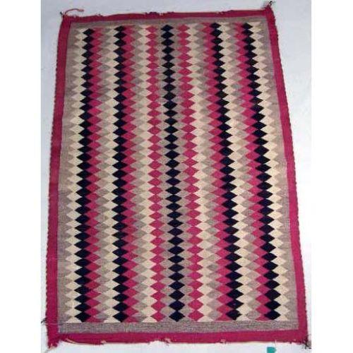A POLYCHROME DIAMOND PATTERN NATIVE AMERICAN WOVEN RUG<BR><BR>In shades of red, brown, beige, and black, with a brown and beige border, wear, losses to border, 63"l x 43"w