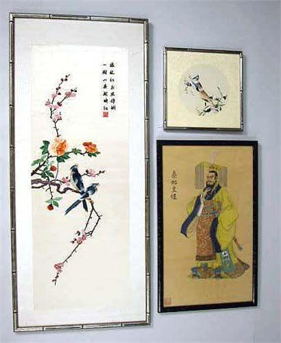 Probably Chinese, depicting an elaborately robed man in a beaded hat, stamped ll. Foxing. 23 1/2"h x 13 1/2"w. Together with two bird motif embroidered panels on silk. 7"dia. and 36"h x 14"w.