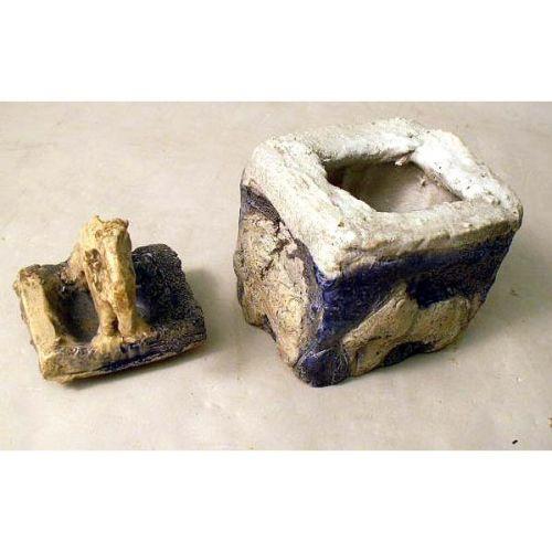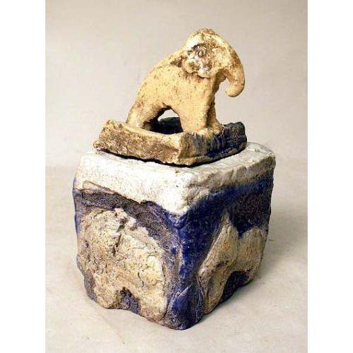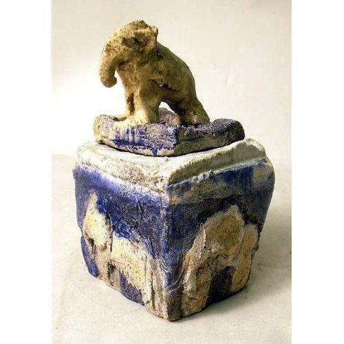 A POLYCHROME GLAZED AND ELEPHANT-DECORATED EARTHENWARE COVERED BOX<BR><BR>Attributed to Elizabeth Nields, (Okego, NY) 7 1/2"h x 4 1/2"w x 3 1/2"d