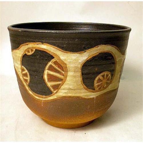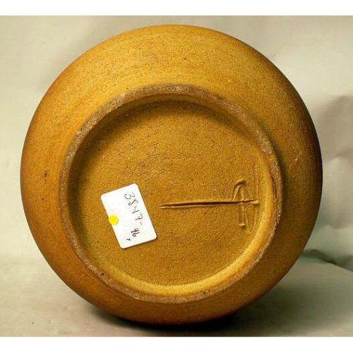A POLYCHROME GLAZED AND LEMON-DECORATED REDWARE DEEP BOWL<BR><BR>The underside incised with a maker`s mark, 9"h x 11"dia.