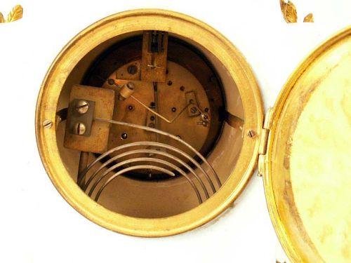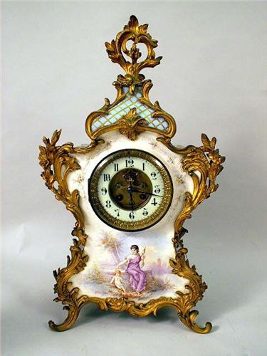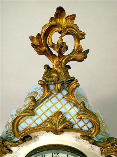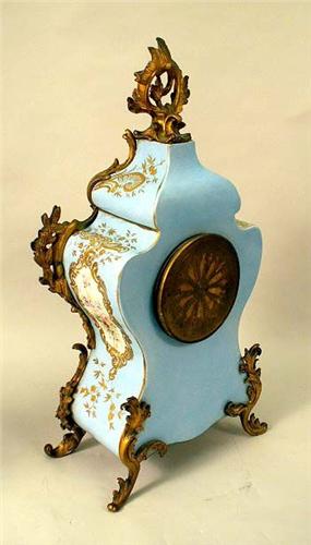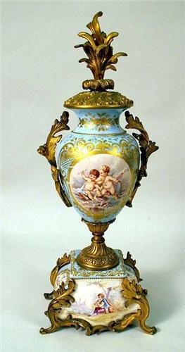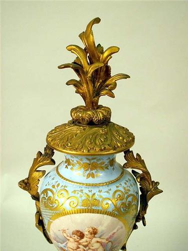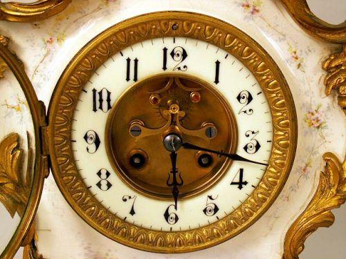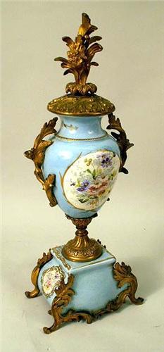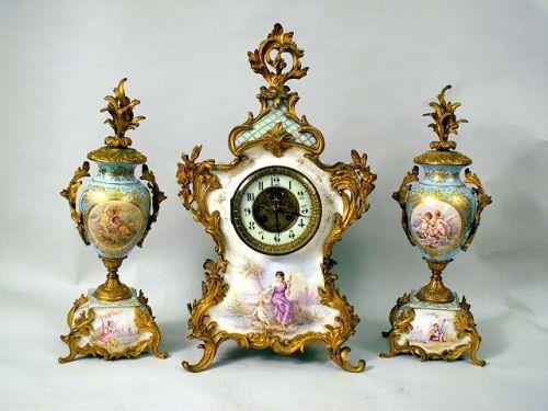 French, comprising an enamel faced clock and two urns. Losses. From 17 1/2" to 20 1/2"h.