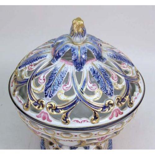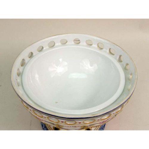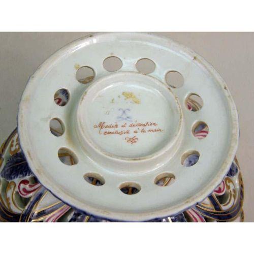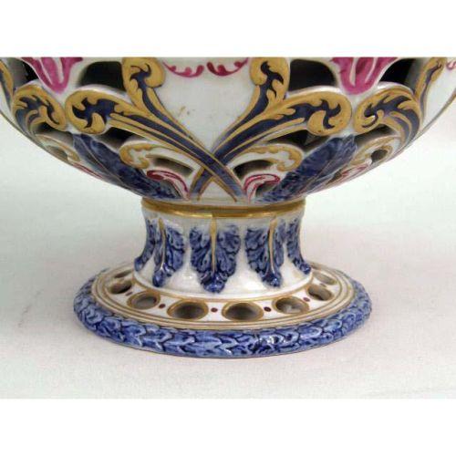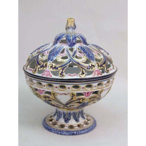 A POLYCHROME PARCEL-GILT DECORATED PORCELAIN COMPOTE<BR><BR>With a reticulated cover, stamped underside with Sevres mark, 10"h
