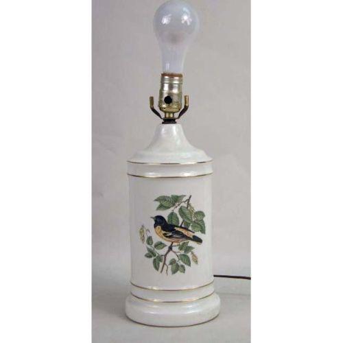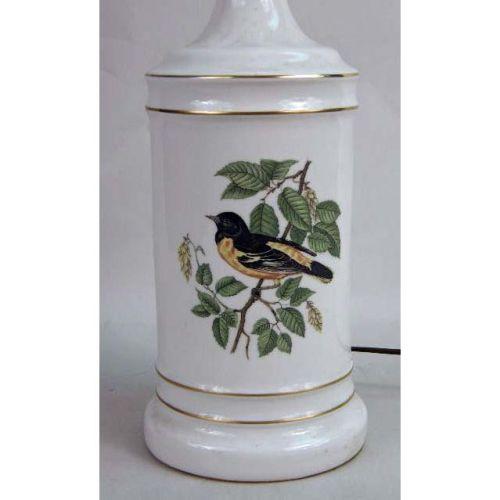 A POLYCHROME PARCEL-GILT DECORATED PORCELAIN LAMP<BR><BR>Decorated with a bird, 12"h