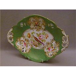 A PORCELAIN COMPORT, c.1850, oval with a green ground reserving flower paintings and an exotic bird, (s.d.) £30-50