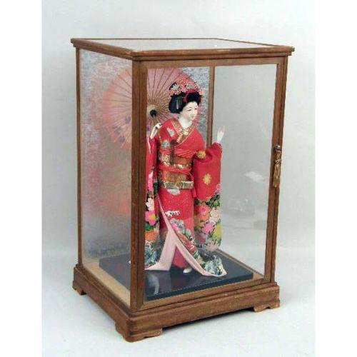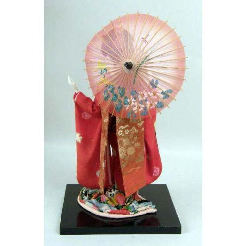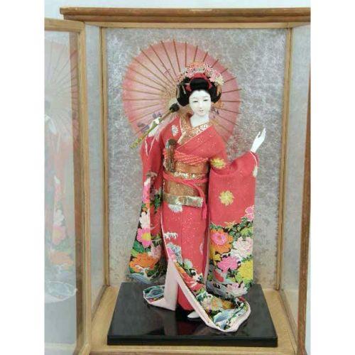 A PORCELAIN GEISHA DOLL<BR><BR>In a presentation case, wearing a silk kimono and carrying a silk parasol, 16"h