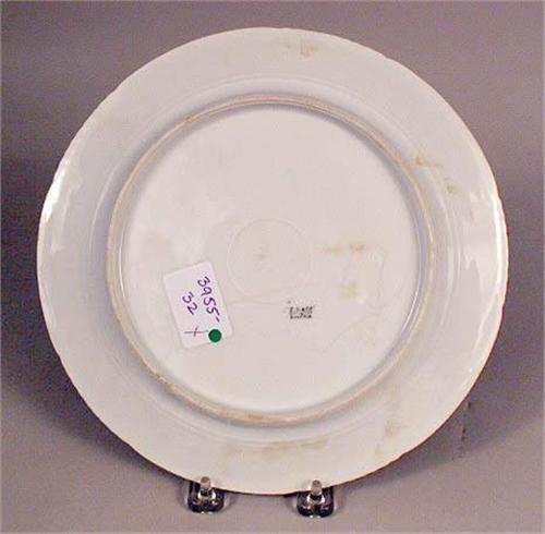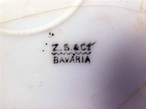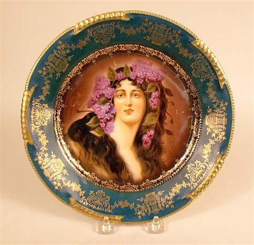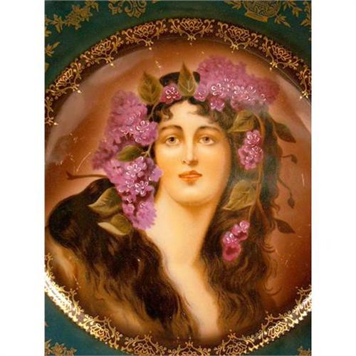 Depicting a portrait of a woman wearing a head ornament of lilacs, the underside marked ZS&CT Bavaria. Wear and cracks. 9 1/4"dia.
