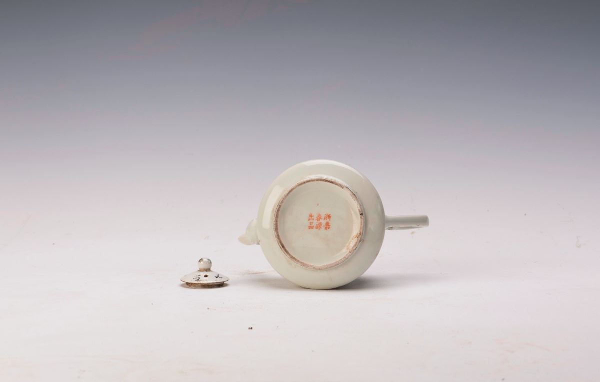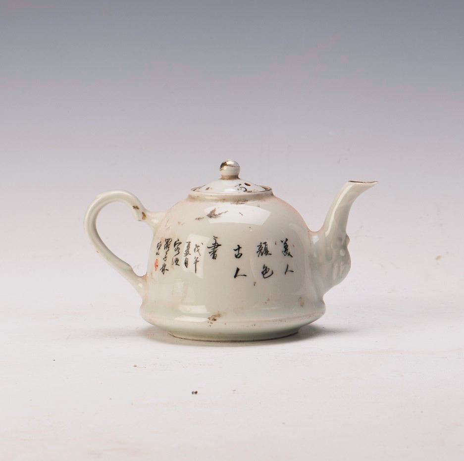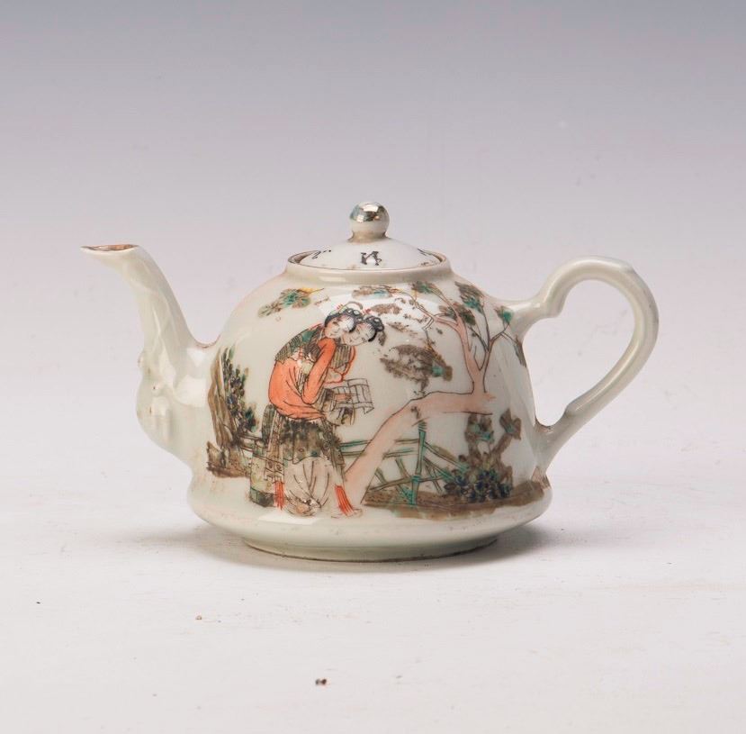 A porcelain teapot with figural Chinese Paintings and relief on the spout. Length 6.5" Width 4.5" Height 4"