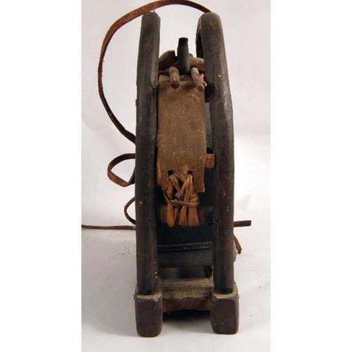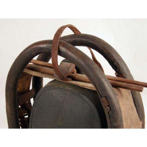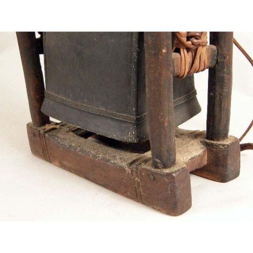 A PORTABLE CHINESE OR JAPANESE BUDDHIST BELL<BR><BR>on a bentwood and block-carved wooden frame. 15" h.