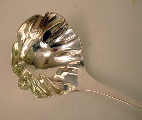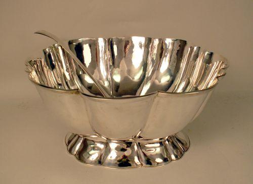 Marked on the underside H. Rogovin, Hand Wrought, Sterling Silver, the oval bowl with scalloped form raised on a conforming undulating base with conforming shell shaped punch ladle. Bowl approximately 135 T.O., ladle approximately 14 T.O.