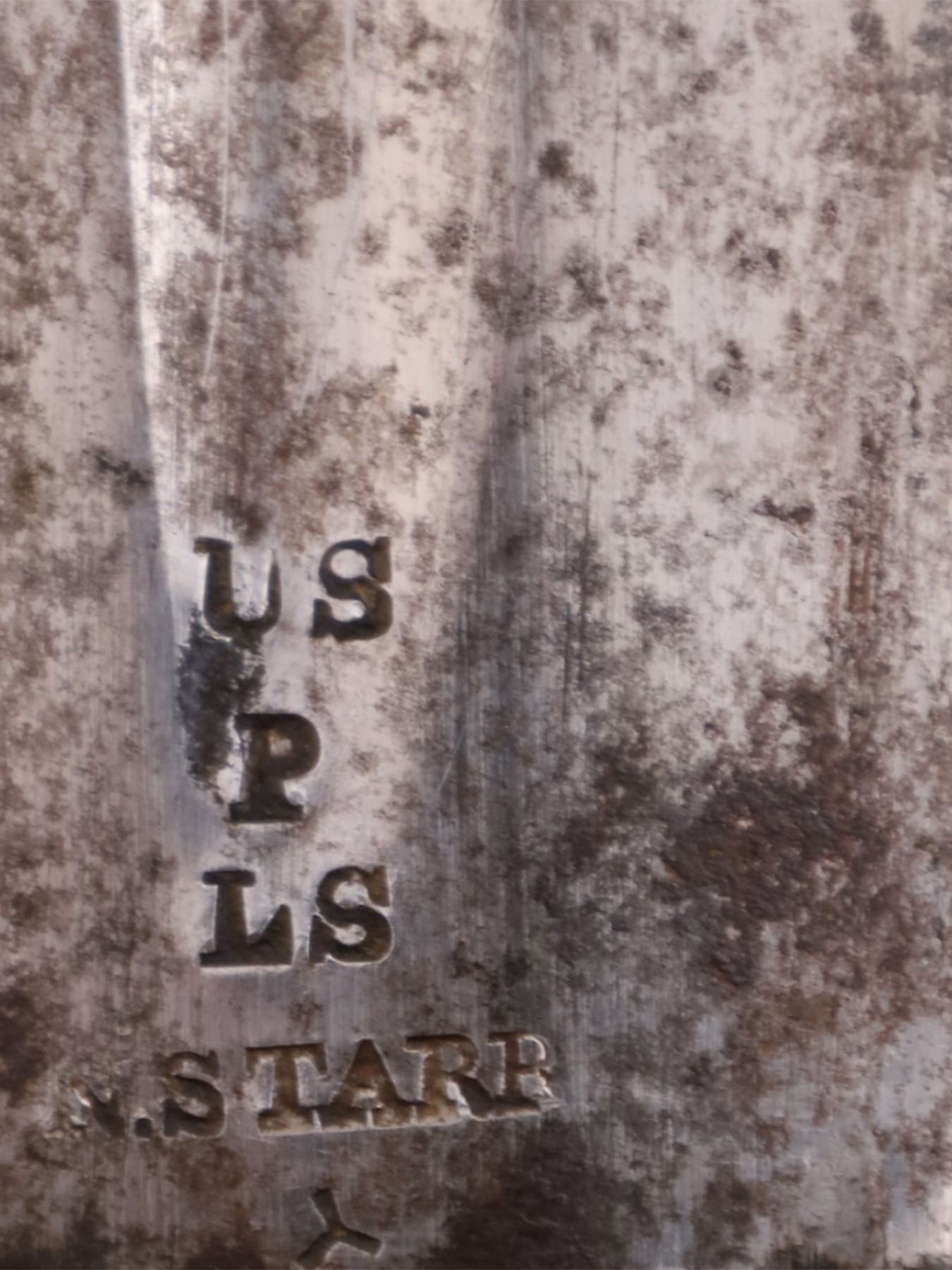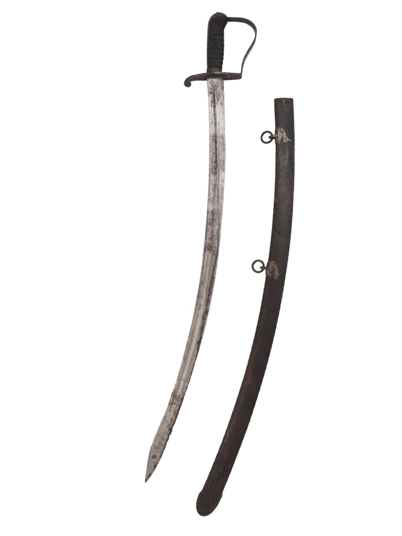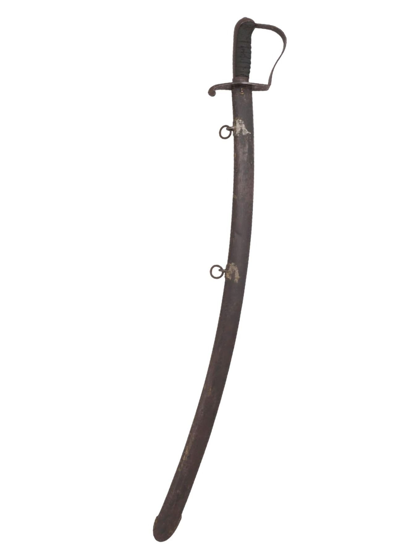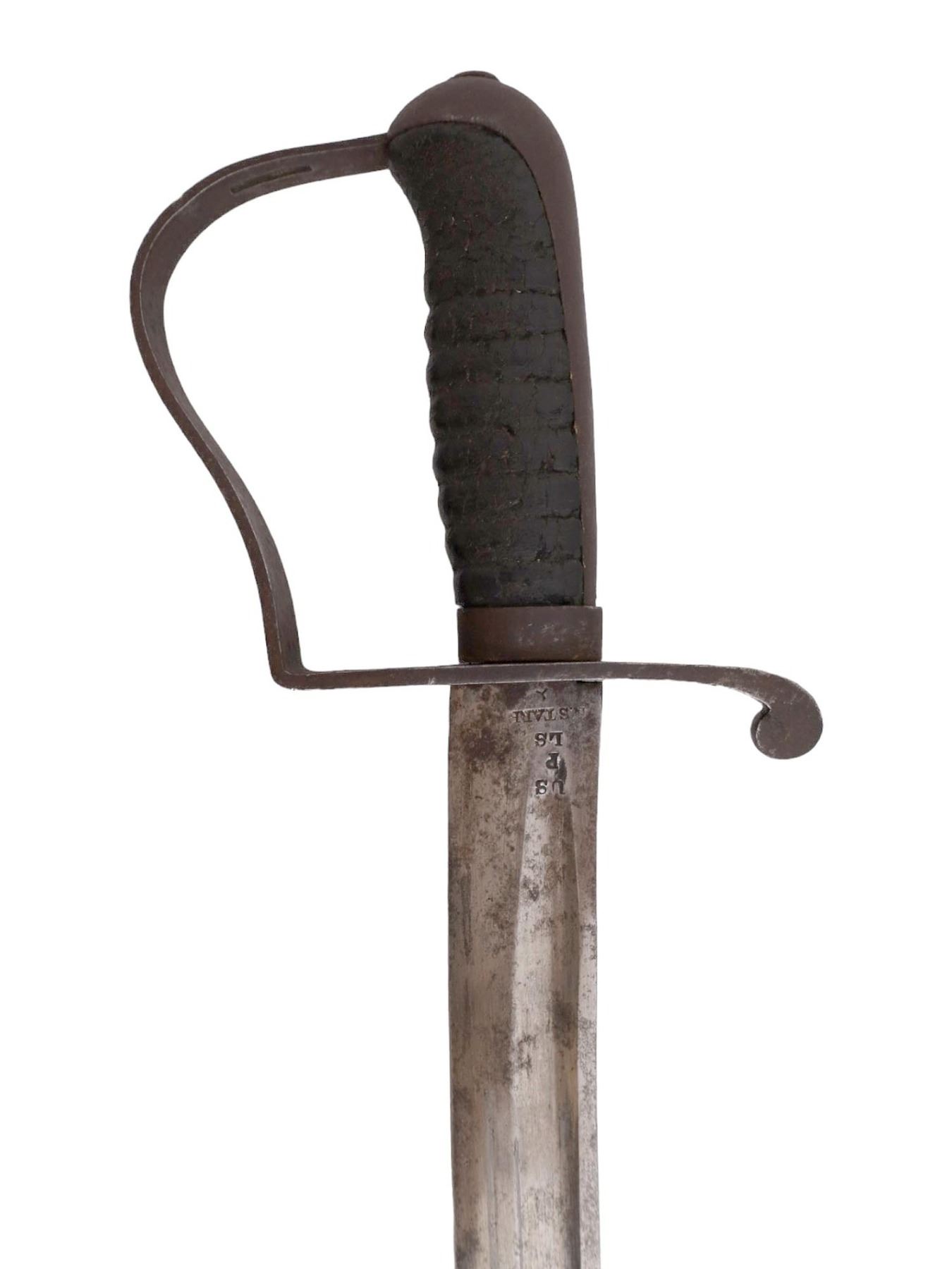 Nathan Starr M1818 cavalry sword is stamped on the ricasso: US, P, LS, N. STARR. The D-Guard is stamped 1821. The scabbard has been repainted.