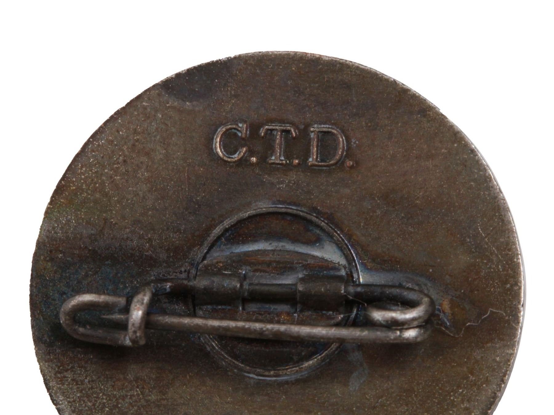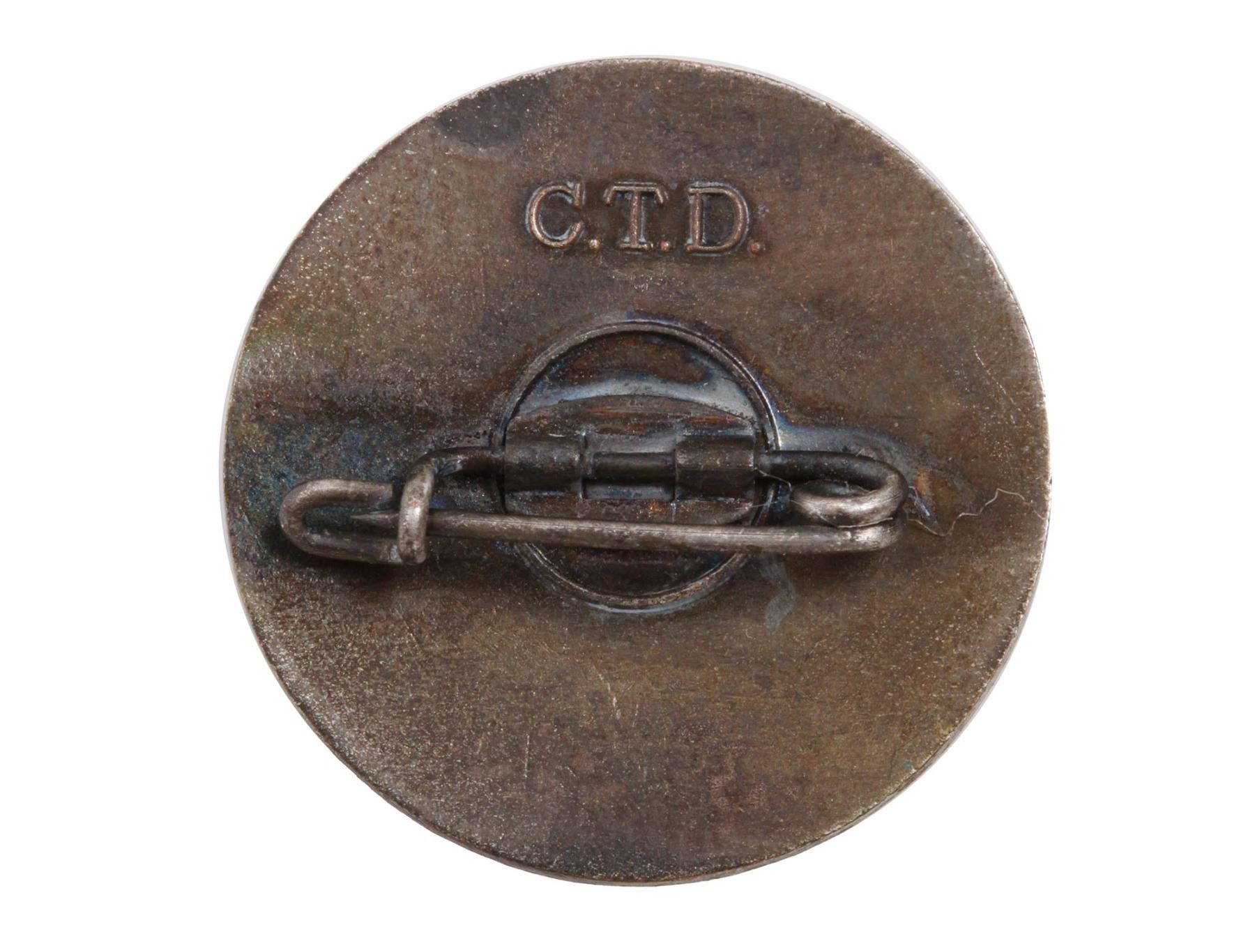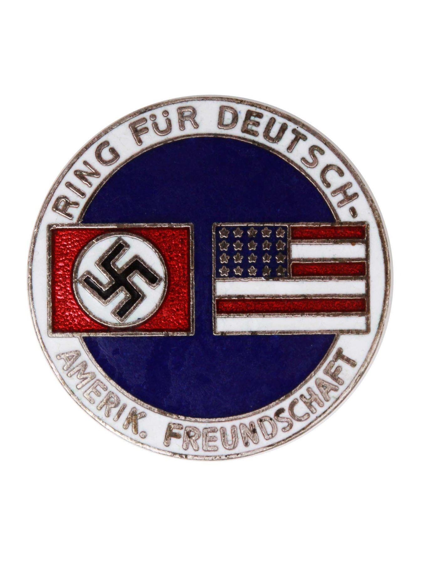 An original Pre-War Period Nazi German and American friendship pin badge enameled on dark brass-tone metal with Nazi German and American flags shown side by side in apparent solidarity. Marked with C.T.D for the manufacturer on verso.
