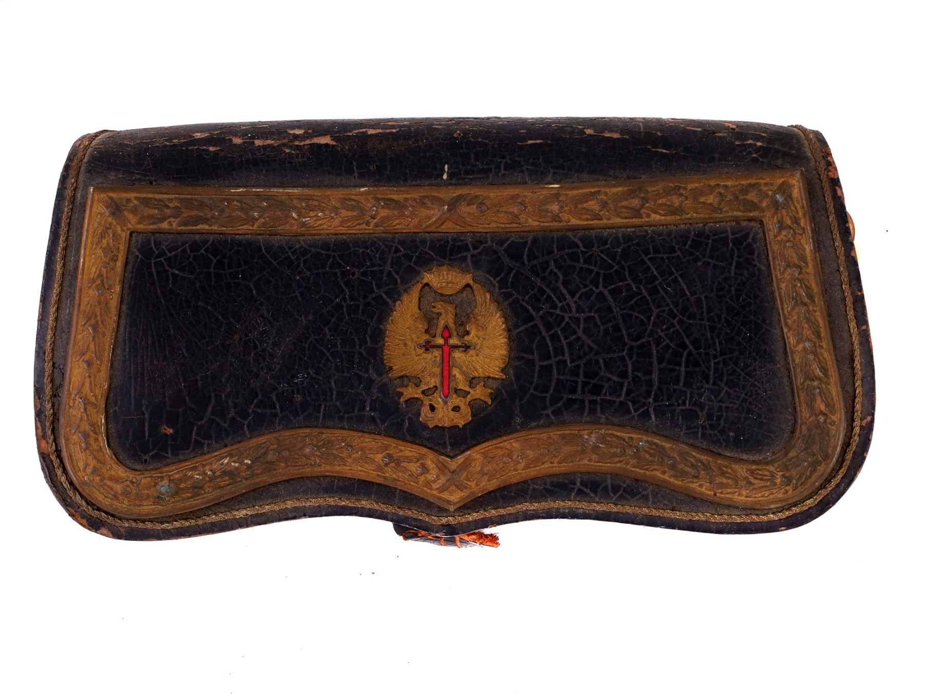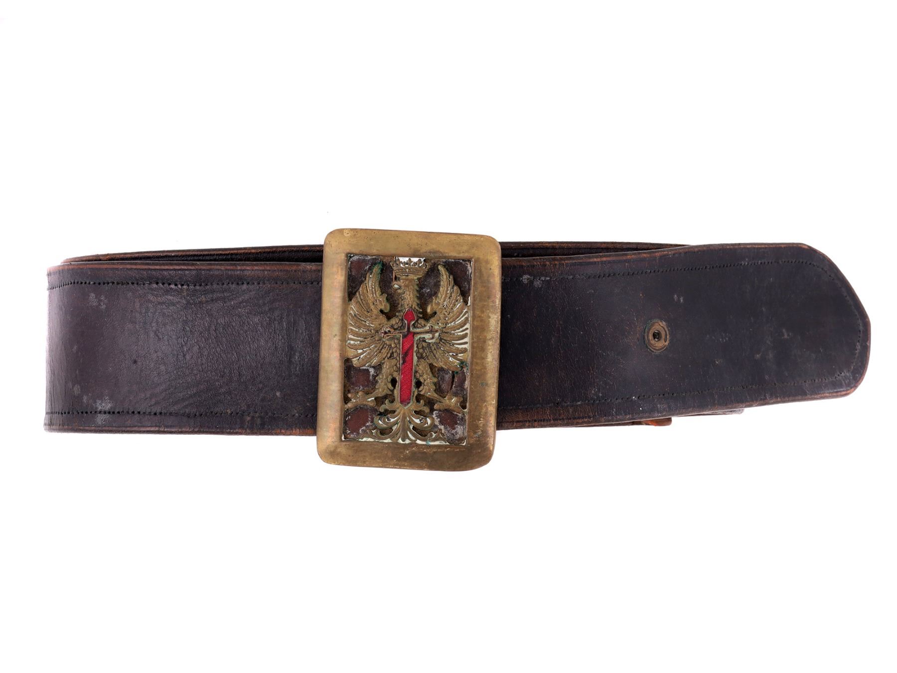 A Spanish parade belt and belt pouch from Franco era Spain. The belt buckle is made of brass, and depicts the crowned Spanish Imperial Eagle holding a red sword made of enamel. The belt itself is worn but in fair condition for its age, showing some signs of use, the leather being dry from age. The leather of the belt pouch is also dry from age, with some cracking throughout, especially on the hinge part. The fittings are all of brass, and the face is decorated with the Spanish Imperial Eagle and red sword of enamel and a border of branches. The box of the pouch is made with red leather.