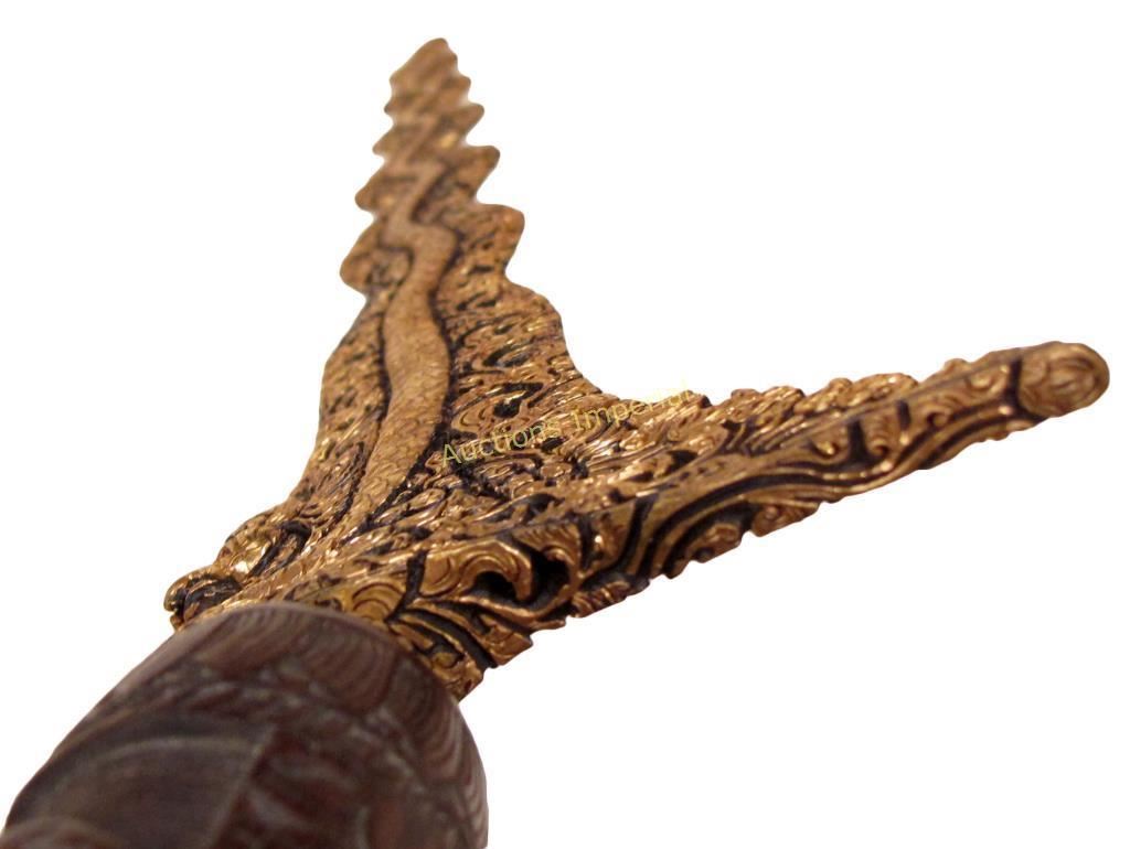 The finely carved grip of exotic hardwood terminating in a horse’s head rests upon a gilded mendak. The handforged, multi-waved blade of Beras Wutah-type pattern-welded steel is elaborately chiseled at the forte and gilded throughout. In its carved wooden scabbard depicting a winged horse surrounded by flowering vinework. Second half of the 20th century. Overall length 50 cm.