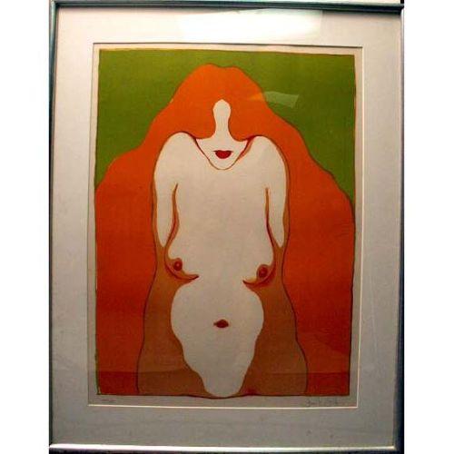 A PRINT IN POLYCHROME OF A NUDE<BR><BR>Bears signature lr Frank Gallo (American, b. 1933), numbered 147/250, the verso bears a label "Ink River Gallery, Flemington, NJ, Frank Gallo, 1960s, stone lithograph". 26"h x 20"w.