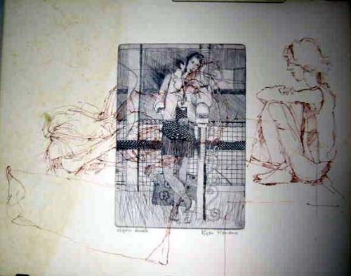 A PRINT OF A FIGURE BY POST; Pencil signed LR Rien Renoma, red ink sketch over etching 11"h x 13 3/4"w