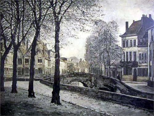 A PRINT OF A STREET SCENE AND BRIDGE; Pencil signed illegibly, LR 13"h x 18"w