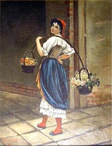 A PRINT ON CANVAS OF A EUROPEAN WOMAN; Signed lr, M. Sauret, 13 1/2"h x 10 1/2"w, losses