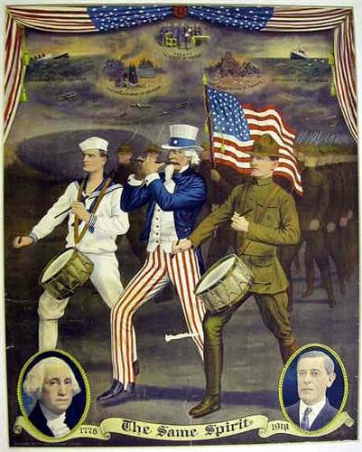 A PRINT TITLED "SPIRIT OF '76"; Depicting George Washington 1776, and Woodrow Wilson 1918 with pre World War I scenes, 20" x 16", matted