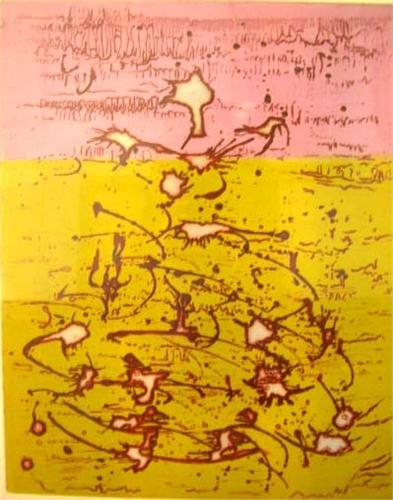 A PRINT; By Margot Lovejoy, (Canadian, B. 1930) An abstract work in tones of pink and yellow, 22"h x 18"w
