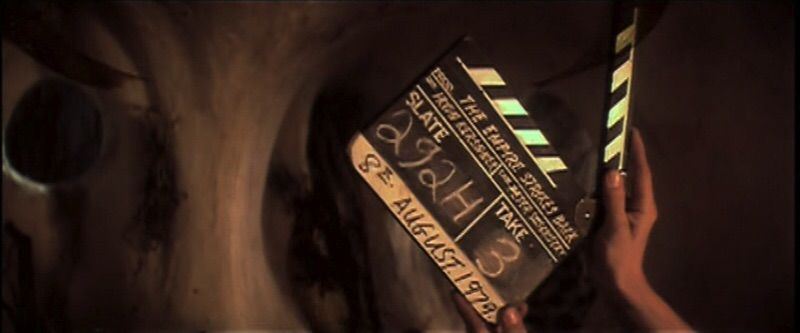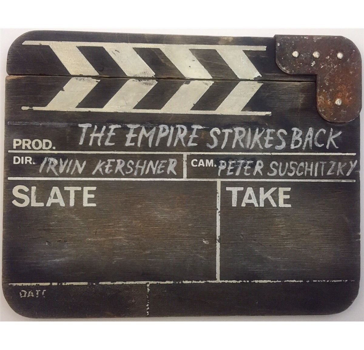 AN 8x10 INCH PRODUCTION USED CLAPPERBOARD USED FOR STAR WARS THE EMPIRE STRIKES BACK. THE CLAPPERBOARD HAS THE DIRECTORS NAME IRVIN KERSHNER AND THE CINEMATOGRAPHERS NAME PETER SUSCHITZKY WRITTEN ON IT AND SHOWS SIGNS OF EXTENSIVE USAGE. THE LOT LISTING SHOWS BEHIND THE SCENES PHOTOS THAT DEPICT THIS OR SIMILAR CLAPPERBOARDS USED DURING THE FILMING OF THE MOVIE. PRODUCTION USED STAR WARS ITEMS ARE VERY RARE AND HARD TO FIND.