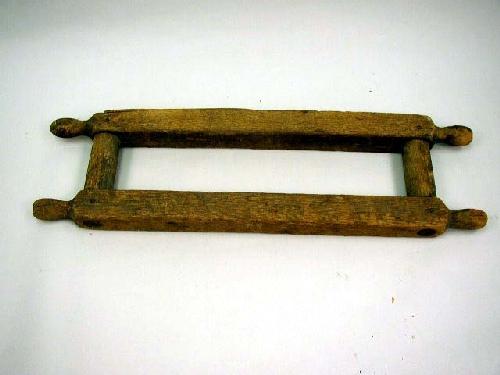 A PROVINCAL OAK BARREL CARRIER; With turned handles 43"l x 12"w