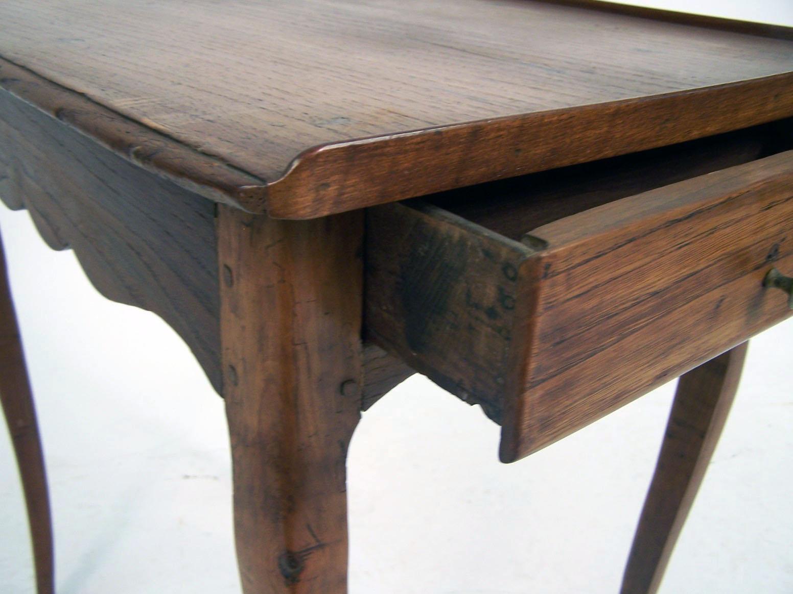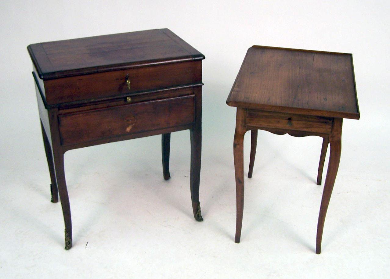 French. The hinged top opening to a mirror flanked by cupboard wells, the case with a retractable slide above a drawer. Together with a French Provincial oak and cherrywood writing table. From 24 1/2"h x 23"w x 17"d to 28"h x 23"w x 15 1/2"d