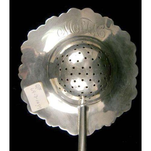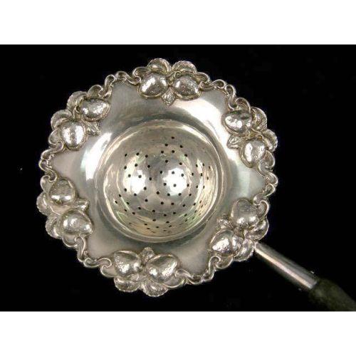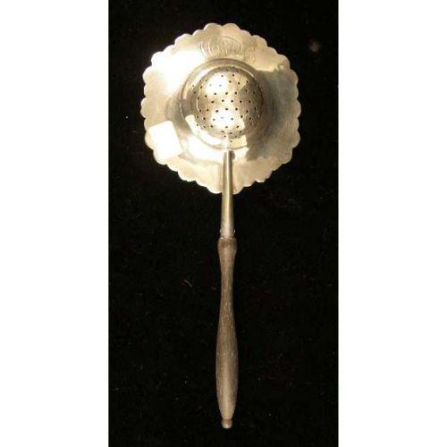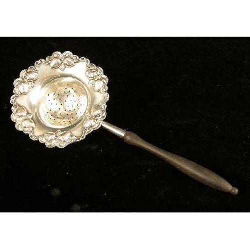 A PRYOR MFG CO., NEWARK STERLING SILVER WOODEN HANDLED TEA STRAINER<BR><BR>With applied strawberry motif border, monogrammed on reverse "M.M.H", 9"long