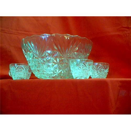 A PUNCH BOWL AND 12 CUPS FROM HOCKING GLASS CO. IN ARLINGTON PATTERN(1986).EXCELLENT CONDITION.