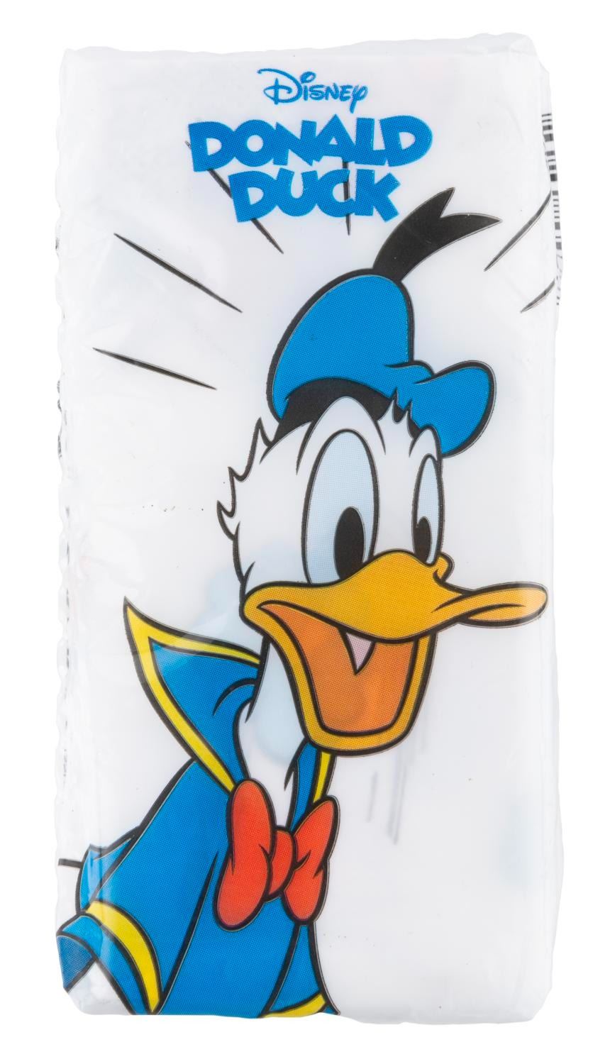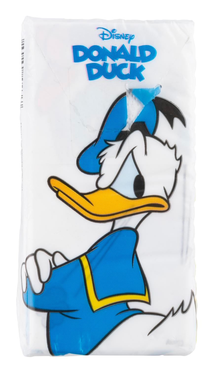 (Disney, 2010s) A pack of Donald Duck travel tissues. The tissues are in fine unopened condition, with a small tear in the tab on the angry Donald side.