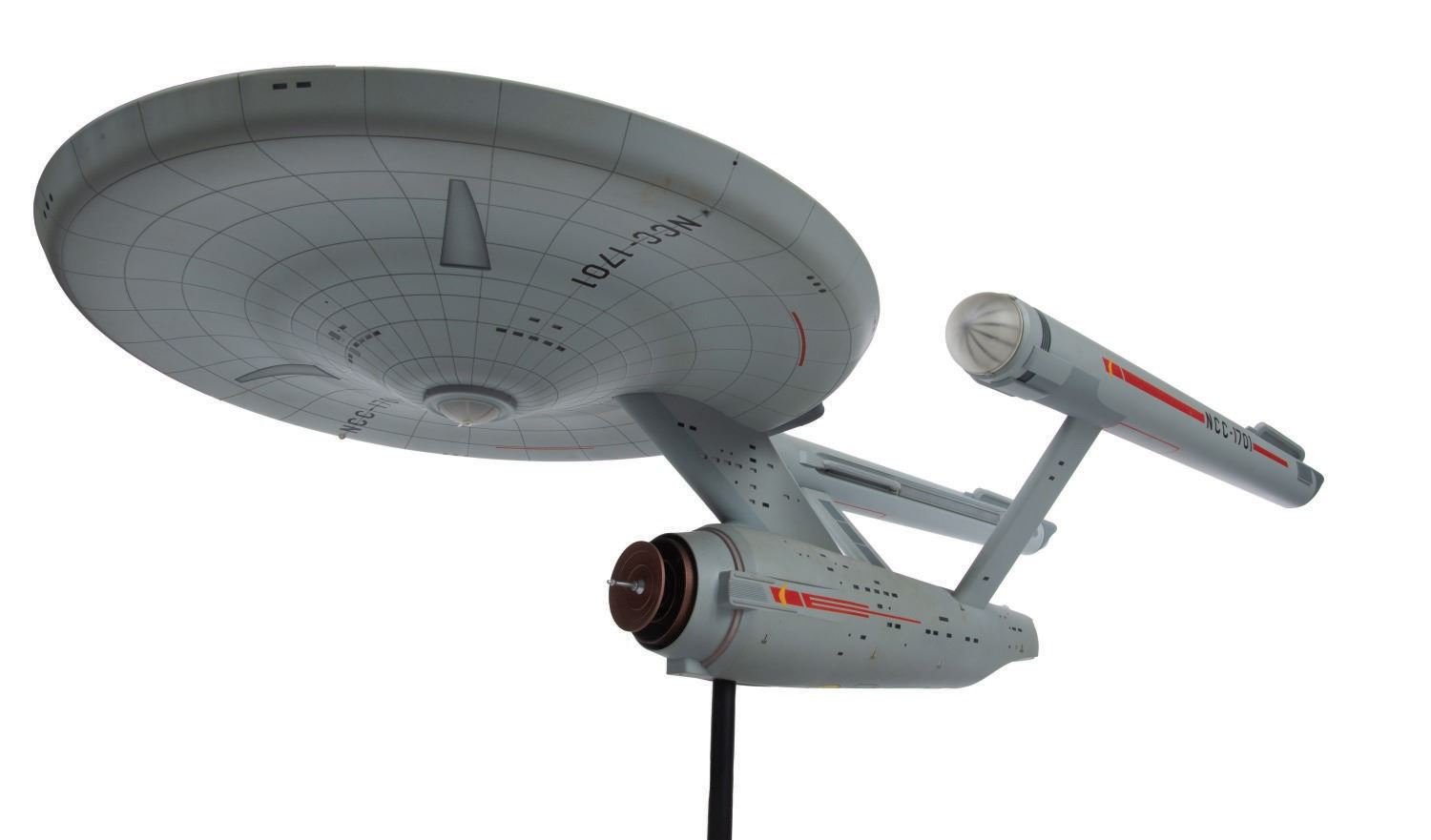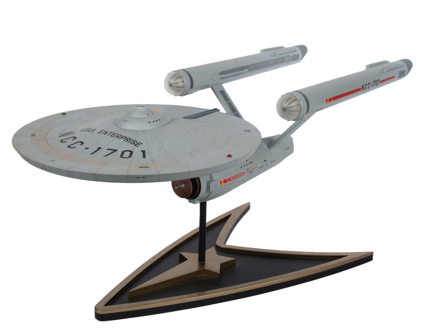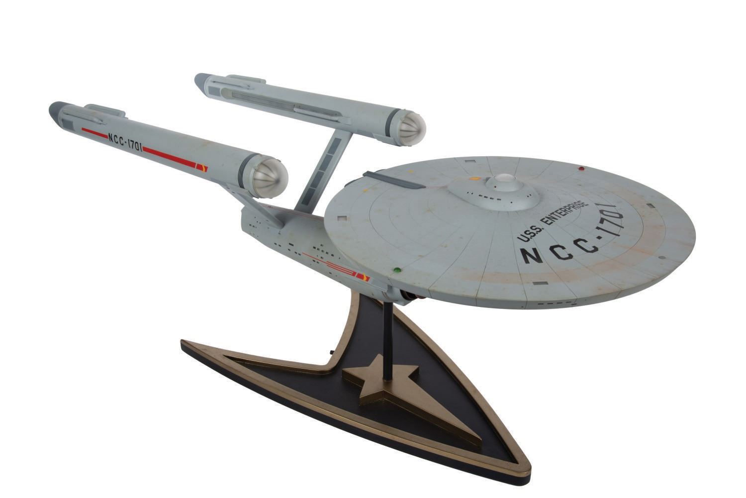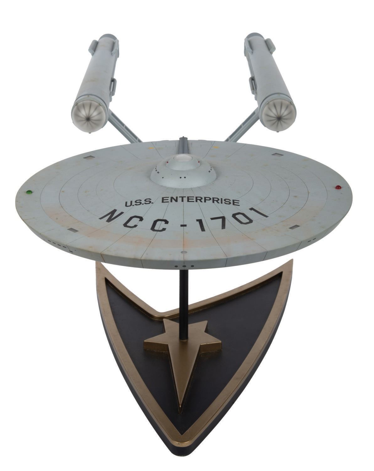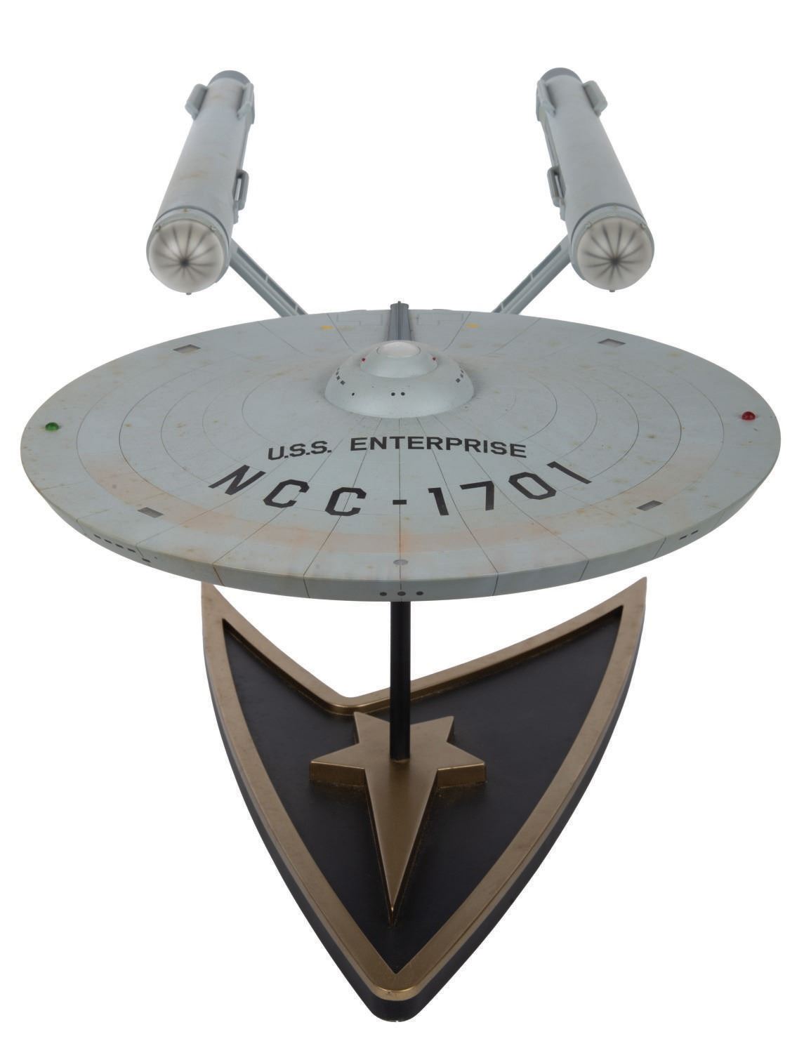 (Master Replicas, 2006) A rare Paint Master of the U.S.S. Enterprise 40th Anniversary Commemorative Edition model by Master Replicas. Used for final production approvals, this rare paint sample features inscribed lines on the hull, and color design by Paint Master Jim Key. It has functioning running ship lights but does not have the illuminating nacelles included in later prototypes and final models. The display base has a push-style switch (rather than rocker). It comes with a plaque signed by William Shatner (Captain James T. Kirk), Leonard Nimoy (Mr. Spock), Nichelle Nichols (Lieutenant Uhura), George Takei (Lieutenant Sulu), and Walter Koenig (Ensign Chekov). Measuring 32" long, 14.5" at its widest, 8" tall (and 13.5" tall, atop base), the replica is in fine condition. A 12-volt adapter is required for the electronics.